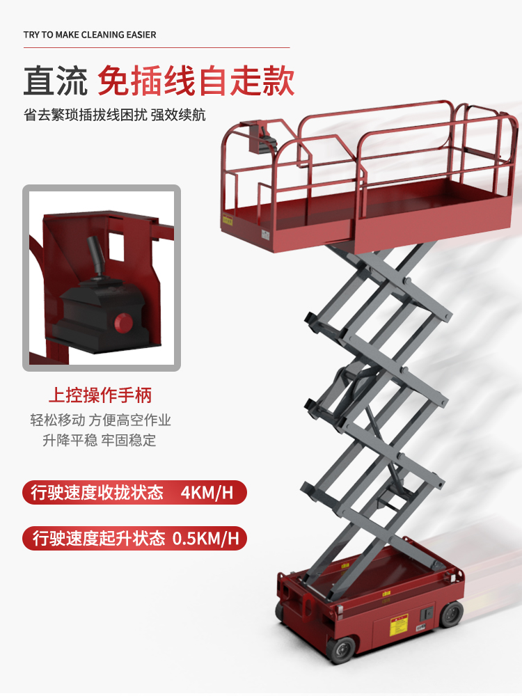 揚子升降平臺:無線自走、堅固穩定、升降平穩、移動方便、彈簧減震、安全環保等優點,還有多場景使用,加長延伸站立臺,還配有應急下降按鈕