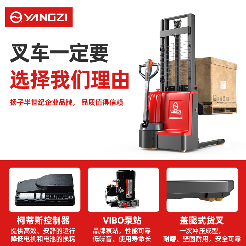 揚子堆高車PS:推高車喇叭設計,人體防撞緩沖設計,低速行駛按鈕設計,前進后退旋轉撥片,還擁有加厚型油缸,專用品牌電池,長久續(xù)航更耐用。