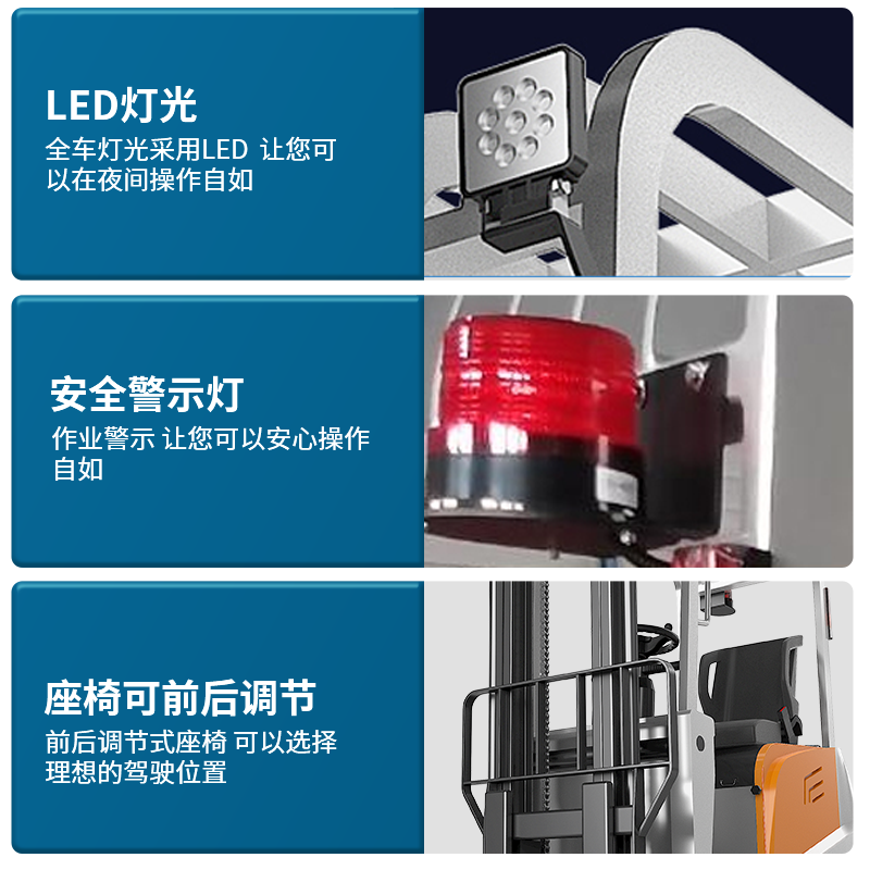 揚子座駕式平衡重電動叉車,360度旋轉,回旋自如靈活性優,前后可調節座椅,全車燈光采用LED,讓你可以在夜間操作自如。