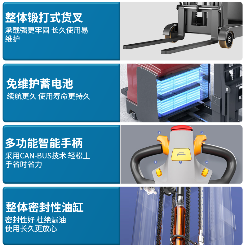 揚子平衡重全自動堆高車YZ-CPD-J系列的產品是一款省時省力省心的堆高設備,擁有九大核心功能能幫助您解決多種核心難題,大容量免維護電池續航更久,使用壽命更長。